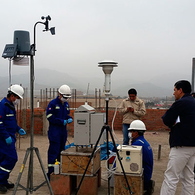 Brindamos los servicios de muestreo y monitoreo de Material Particulado (PM10 y PM2.5), Gases Atmosféricos (SO2, NO2, H2S, CO, O3 y COV), Metales en Suspensión (Pb, As, etc.), Aceites y Grasas (AyG); como el registro de las condiciones Meteorológicas (Velocidad y Dirección de Viento, Temperatura, Humedad, Presión Atmosférica y Precipitación).